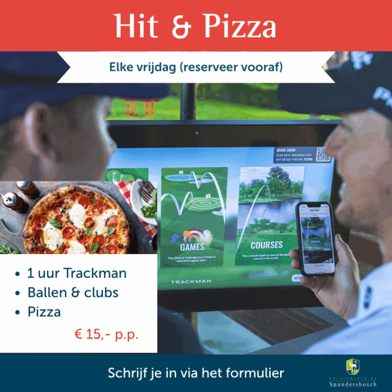 Vanaf 24 oktober starten we op vrijdag avonden vanaf 17.00 met Hit & Pizza. Reserveer samen met vrienden en vriendinnen een Bay voor een uur, krijgt per persoon 25 ballen, gebruik onze clubs en geniet na afloop van een heerlijke pizza in de Brasserie! Je kan met maximaal 4 personen gebruik maken van een Bay, dus als je met meer mensen bent, reserveer dan een extra Bay. € 15,- per persoon!