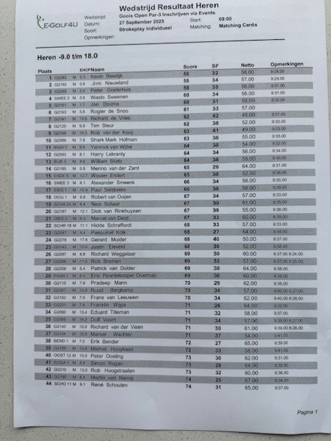 Bij de heren eindigden drie heren met 58 slagen gelijk. Kevin Reedijk, Jimmi Nieuwland en Peter Oosterhuis moesten ook op hole 18 een play-off spelen. Deze werd gewonnen door Peter Oosterhuis. Hij won de play-off door op hole 18 een birdie te slaan. Peter doet zijn verhaal in een podcast, die vanaf 30 september te luisteren is via ‘19e Hole Podcast’.